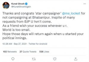 নিউজটাইম ওয়েবডেস্ক : ভবানীপুরের উপনির্বাচনের প্রচারে স্টার ক্যাম্পেনার হিসেবে তালিকায় নাম ছিল বিজেপি সাংসদ লকেট চট্টোপাধ্যায়ের। সোমবার শেষ প্রচারের দিনও তাণকে দেখা যায়নি। এরপর সোমবারই তৃণমূল মুখপাত্রের ট্যুইটে শোরগোল পড়েছে রাজনৈতিক মহলে। কুণাল ঘোষ তাঁর ট্যুইটে লেখেন, ভবানিপুরে বিজেপির হয়ে প্রচার না করার জন্য ধন্যবাদ লকেটকে। পৃথিবা অনেক ছোটো, যেখানেই আছে বালো থাকো। আশাকরি তোমার রাজনৈতিক জীবনের শুরুর দিন গুলি আবার ফিরে আসবে।