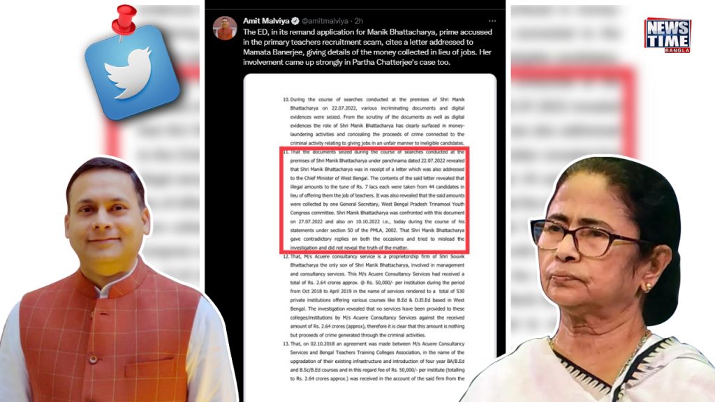 অ্যাকাউন্ট থেকে তিনি একটি টুইট করেছেন। সেখানে মানিক ভট্টাচার্যের বিরুদ্ধে ইডির রিমান্ড