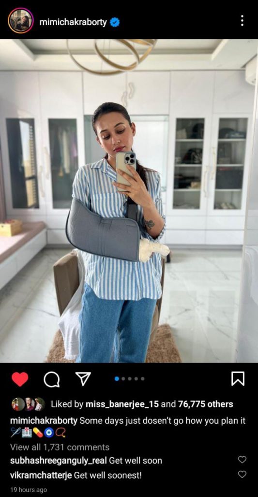 বেশ কিছুদিন ধরেই অসুস্থ টলিউড অভিনেত্রী মিমি চক্রবর্তী । নতুন বছর শুরুও করেছেন হাতের চোট নিয়েই । আর সেই ছবি, পুজো করার ভিডিও নিজে ইন্সটাগ্রামে ভাগ করে নেন সবার সাথে । এবার আরও একবার নিজের অসুস্থতার কথা সবাইকে জানালেন যাদবপুরের সাংসদ মিমি চক্রবর্তী ।