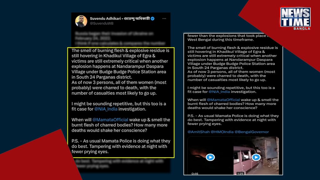 পর পর একই ধরণের ঘটনার জেরে সরগরম রাজনৈতিক মহল ।ইতিমধ্যেই বজবজের এই বিস্ফোরণকে কেন্দ্র করে শুরু হয়ে গিয়েছে রাজনৈতিক চাপানউতোর । এই ভয়াবহ ঘটনাকে তুলে ধরে, সরব হয়েছেন রাজ্যের বিরোধী দলনেতা, শুভেন্দু অধিকারী । একটি টুইট করে তিনি বজবজের ঘটনার এনআইএ তদন্তের দাবি করেছেন ।