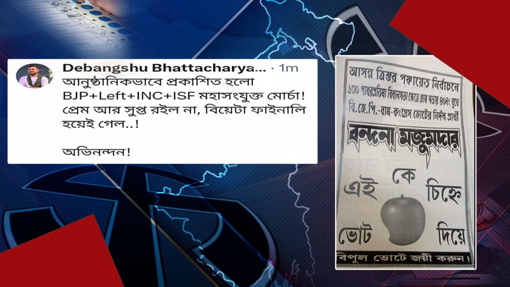 বিজেপির প্রতীকে চারজন ও সিপিএমের প্রতীকে একজন লড়াই করছেন । তৃণমূলের রাজ্য নেতৃত্ব ইতিমধ্যে এই এলাকার নির্দল প্রার্থী বন্দনা মজুমদারের একটি পোস্টার ট্যুইট করেছেন । বিরোধীদের এই জোটকে মহাসংযুক্ত মোর্চা বলে কটাক্ষ করেছে তৃণমূল । বন্দনা মজুমদার জোটের কথা স্বীকার করে নিয়েছেন । তিনি জানিয়েছেন, তাঁরা বিজেপি সমর্থক হওয়ায় তৃণমূল পরিচালিত পঞ্চায়েত থেকে কোন সুযোগ সুবিধা মিলত না; সবক্ষেত্রে বঞ্চিত হতেন । সেই জন্য এলাকার সব দলের পক্ষ থেকে নির্দল হিসেবে তিনি প্রতিদ্বন্দ্বিতা করছেন ।