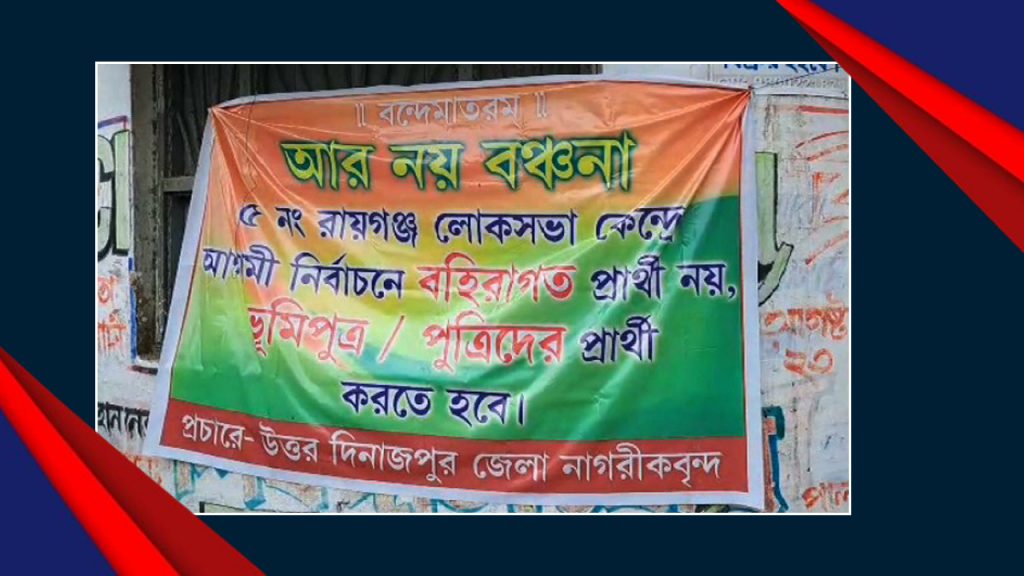 লোকসভা কেন্দ্রে বহিরাগত প্রার্থী নয়, একেবারে ভূমিপুত্র কিংবা ভূমিপুত্রি চাই । এমন দাবি জানিয়ে রায়গঞ্জে পড়ল পোস্টার । আর পোস্টারকে ঘিরে রায়গঞ্জ লোকসভা কেন্দ্রে শুরু হয়েছে রাজনৈতিক তরজা । তবে কি এবারের লোকসভা নির্বাচনে দলীয় নীতি, আদর্শের চাইতে স্থানীয় প্রার্থীই ইস্যু হতে চলেছে রায়গঞ্জে, প্রশ্ন উঠতে শুরু করেছে রাজনৈতিক মহলে ।