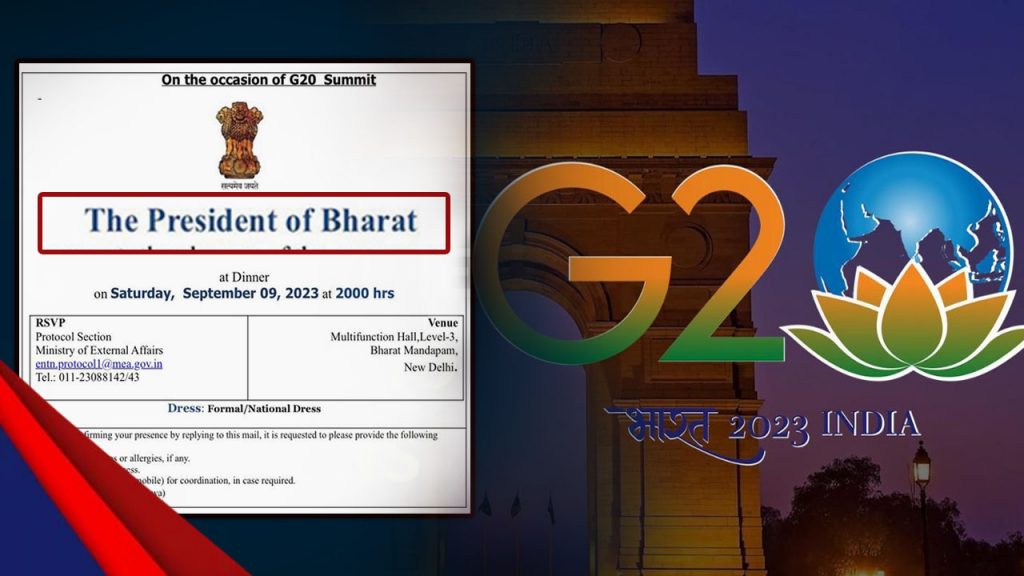 এই বছর জি২০ সম্মেলনের সভাপতিত্ব করছে ভারত । সেই প্রসঙ্গে আগামী ৯ সেপ্টেম্বর বেশ কিছু রাষ্ট্রপ্রধানদের একটি নৈশভোজের আমন্ত্রণ জানিয়েছে “ভারতের” রাষ্ট্রপতি দ্রৌপদী মুর্মু । চিরাচরিতভাবে যেখানে এত বছর ধরে লেখা থাকত প্রেসিডেন্ট অফ “ইন্ডিয়া”, সেখানেই মঙ্গলবার দেখা যাচ্ছে প্রেসিডেন্ট অফ “ভারত” লেখা । আর এই নিয়েই তুঙ্গে উঠছে রাজনৈতিক জল্পনা: তাহলে কি নাম বদল করা হচ্ছে দেশের?