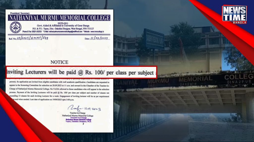 ক্লাস প্রতি মাত্র ১০০ টাকা সাম্মানিকে কলেজে অতিথি অধ্যাপক নিয়োগ বিজ্ঞপ্তিকে কেন্দ্র করে বিতর্কের সৃষ্টি হল শিক্ষক মহলে। তপনে অবস্থিত নাথানিয়াল মুর্মু মেমোরিয়াল কলেজের নিজস্ব ওয়েব সাইটে দেওয়া বিজ্ঞপ্তিতে জানানো হয়েছে ৬ ছয় জন অতিথি অধ্যাপক নিয়োগ করা হবে ।