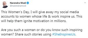 নিউজটাইম ওয়েবডেস্ক : অবশেষে জল্পনার অবসান ঘটল।নারী দিবসে অনুপ্রেরণামূলক মহিলাদের হাতে নিজের সোশ্যাল মিডিয়া অ্যাকাউন্ট তুলে দেবেন। মঙ্গলবার নিজেই টুইট করে একথা জানান প্রধানমন্ত্রী নরেন্দ্র মোদী।