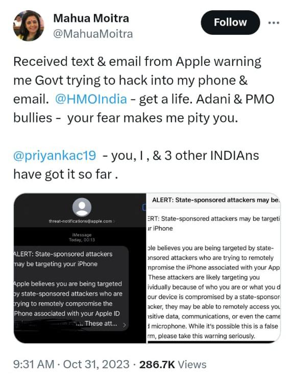 সাংসদ মহুয়া মৈত্রর অ্যাপেল আইডি ‘হ্যাক’ করার চেষ্টা করা হচ্ছে । আর সেই চেষ্টা চালাচ্ছে রাষ্ট্রপরিচালিত ‘হ্যাকাররা’ । অ্যাপেল সংস্থা থেকে সাংসদকে পাঠানো এমনই এক বার্তা নিজের এক্স হ্যান্ডেলে ভাগ করে নিলেন সাংসদ ।