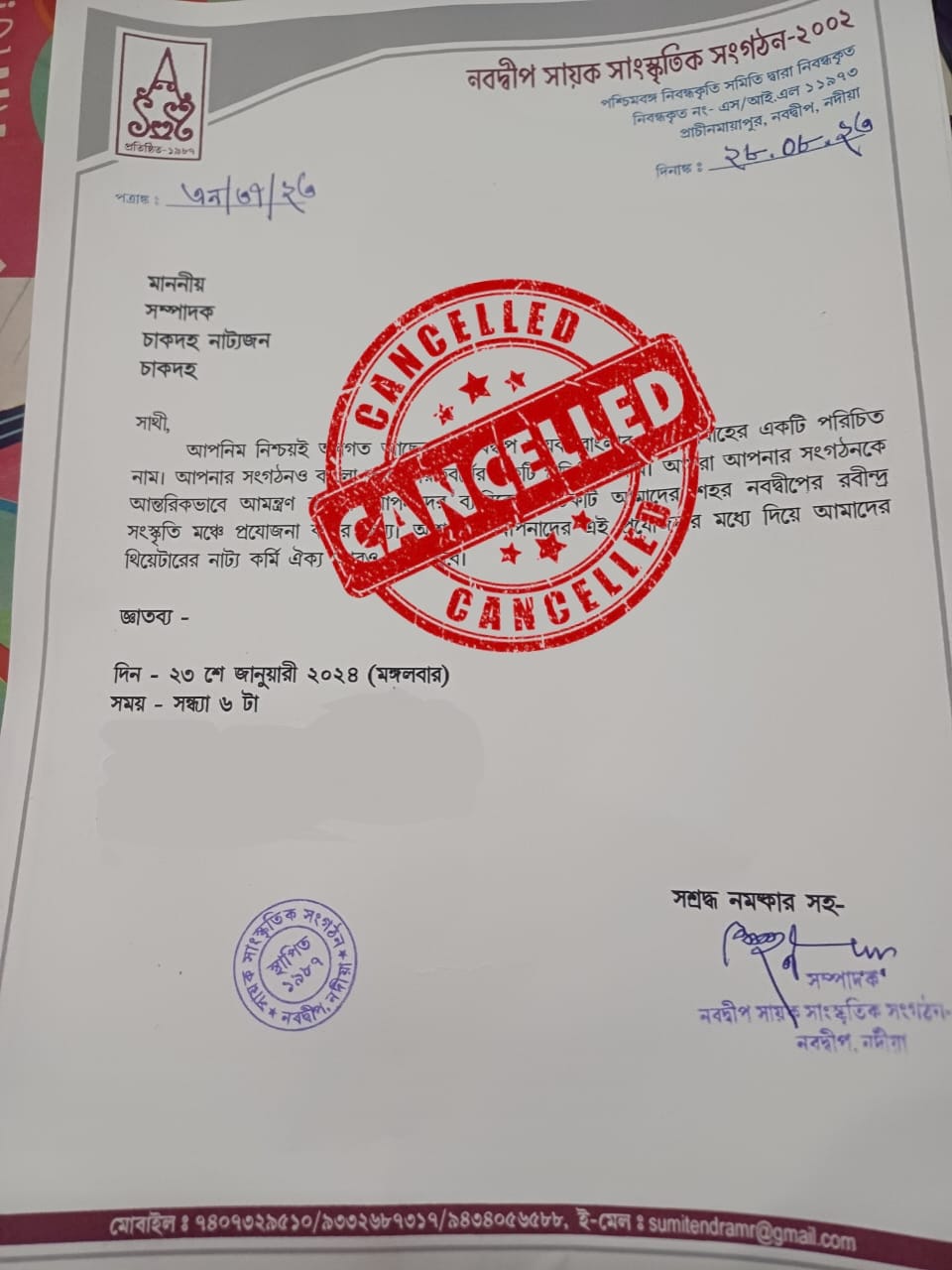 চৈতন্য ভবনে মঞ্চস্থ হওয়ার কথা থাকলেও নবদ্বীপ পুরসভার নির্দেশে বাতিল করা হল বুকিং । এই ঘটনায় পৌরসভার কর্তৃপক্ষের পক্ষ থেকে কোনও প্রতিক্রিয়া দেওয়া হয়নি । তবে সূত্র মারফত জানা যাচ্ছে, সেই সময় বইমেলা আয়োজিত হয় । তাই সরকারি অনুষ্ঠানের জন্য চৈতন্য ভবনের প্রয়োজন পড়তে পারে, এমনটা আশঙ্কা করেই এই নাটকের বুকিং বাতিল করা হয়ে থাকতে পারে বলেই প্রাথমিকভাবে মনে করা হচ্ছে ।
