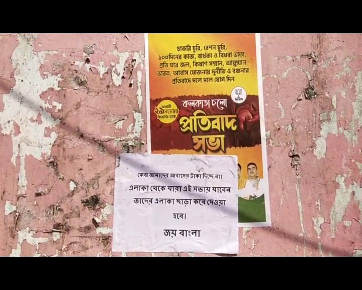 আগামী ২৯শে নভেম্বর কলকাতায় বিজেপির প্রতিবাদ সভা রয়েছে । সেই প্রতিবাদ সভা সংক্রান্ত চুঁচুড়ার কেউটা বটতলা এলাকায় বহু দেওয়ালে আটকানো হয়েছে পোস্টার । বিজেপির এই সকল পোস্টারগুলির নীচে সাদা কাগজে লাগানো লেখা রয়েছে, কেন্দ্র আবাসের টাকা দিচ্ছে না; এলাকা থেকে যারা এই সভায় যাবেন তাদের এলাকা ছাড়া করে দেওয়া হবে ।