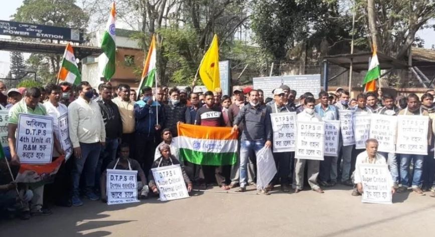 রাষ্ট্রায়ত্ত দুর্গাপুর থার্মাল পাওয়ার স্টেশনের গেটে ভারতীয় মজদুর সংঘের পতাকা হাতে বিক্ষোভ দেখান বিজেপি বিধায়ক, তাঁর অনুগামীদের সরিয়ে দিয়ে কাজে যোগদান করলেন অস্থায়ী শ্রমিকরা।