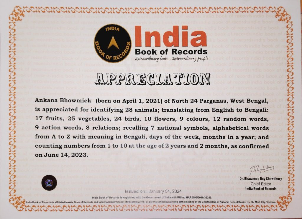 ফুল-ফল, সব্জি, পশুপাখি, বারো মাসের নাম, বিভিন্ন শব্দের অর্থ, সহ ইংরেজী বাংলার বর্ণগুলি বলে দিতে পারে মুহূর্তের মধ্যে । গড় গড় করে বলে দিচ্ছে জাতীয় পশু, পাখি, ফলের নাম, রং নাম সহ মাস ও বছরের নাম । দুই বছর দুই মাসের শিশু কন্যার এই প্রতিভার স্বীকৃতি দিল ইন্ডিয়া বুক অব রেকর্ডস । একেবারে ১৫ টি বিষয়ের স্তর পার করে ইণ্ডিয়া বুক অফ রেকর্ডস গড়ল উত্তর ২৪ পরগণার গাইঘাটা থানার রামপুর ভাটপাড়ার ছোট্ট মেয়ে অঙ্কনা ভৌমিক ।