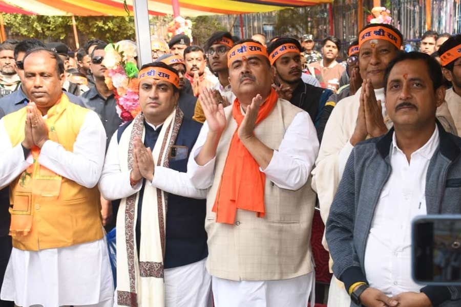 উত্তর কলকাতার বৈকুণ্ঠ মন্দির থেকে দক্ষিণ কলকাতার রাম মন্দির পর্যন্ত একটি পদযাত্রায় সামিল হন বিরোধী দলনেতা শুভেন্দু অধিকারী । পরবর্তীকালে তাঁকে দেখা যায় বিজেপি কাউন্সিলর সজল ঘোষের একটি অনুষ্ঠানে । এদিন লেবুতলা পার্কে ছিল অযোধ্যার রাম মন্দির প্রতিষ্ঠানের সম্প্রচার অনুষ্ঠান । সেই অনুষ্ঠানে অংশগ্রহণ করেন বিরোধী দলনেতা । অন্যান্য বিজেপি নেতৃত্বের সঙ্গে সেই সম্প্রচার অনুষ্ঠান দেখেন তিনি ।