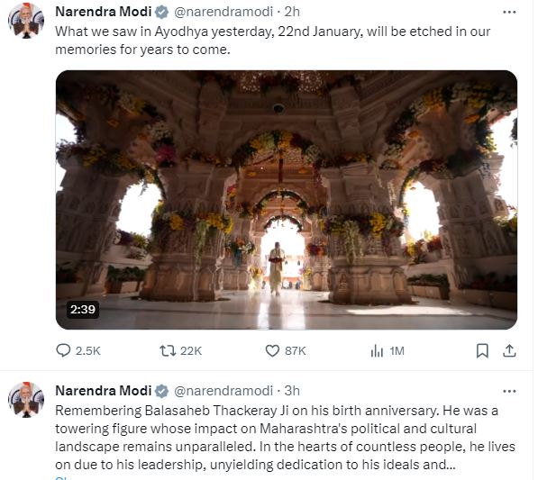 এই সবের মধ্যেই মঙ্গলবার সকালে প্রধানমন্ত্রী নরেন্দ্র মোদী নিজের এক্স হ্যান্ডলে ৩ মিনিট ৫ সেকেন্ডের একটি ভিডিও পোস্ট করেন । সেই ভিডিওতে রয়েছে সোমবার মন্দির উদ্বোধনের একাধিক মুহূর্তের ছবি। ভিডিওর প্রথমেই দেখা যায়, পুজোর সামগ্রী নিয়ে মন্দিরে ঢুকছেন প্রধানমন্ত্রী। তার পর দেখা যায়, আবেগে চোখের জল মুছছেন ভক্তদের একাংশ। প্রধানমন্ত্রী রামলালাকে আরতি করছেন, এই দৃশ্যও রয়েছে ওই ভিডিয়োয়। মোদীর বক্তব্যের একাংশও ছিল ভিডিওটিতে। পোস্ট করে প্রধানমন্ত্রী লেখেন, “আমরা ২২ শে জানুয়ারি অযোধ্যায় যা দেখলাম, তা আমাদের স্মৃতিতে আজীবন রয়ে যাবে।”