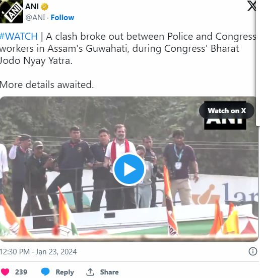 অসমে পুলিশের বাধার মুখে রাহুল গান্ধীর ভারত জোড়ো ন্যায় যাত্রা। গুয়াহাটি শহরে ঢোকার চেষ্টা করতেই পদযাত্রা রুখে দেয় পুলিশ। পালটা ব্যারিকেড ভাঙার চেষ্টা করেন কংগ্রেস কর্মীরা। পরিস্থিতি নিয়ন্ত্রণে আনতে পুলিশ লাঠি চালায় বলে অভিযোগ। এই বিষয়টি ঘটে রাহুল গান্ধীর সামনেই । ৩৭ নম্বর জাতীয় সড়ক ধরে এগনোর কথা ছিল ন্যায়যাত্রার। মাঝেই ছিল খানাপাড়া, গুয়াহাটি শহরে প্রবেশপথ। সেখানে সকাল থেকেই নিরাপত্তার চাদরে মুড়ে ফেলা হয়। অভিযোগ, সেখানে পৌঁছনোর পর প্রদেশ কংগ্রেস সভাপতি রিপুণ বোরা এবং সাংসদ গৌরব গগৈ কংগ্রেস কর্মীদের শহরে ঢোকার ডাক দেন। সেই সময়ই পরিস্থিতি উত্তপ্ত হয়। পরিস্থিতি নিয়ন্ত্রণে রাখতেই পুলিশ লাঠিচার্জ চালায় বলে অভিযোগ ।