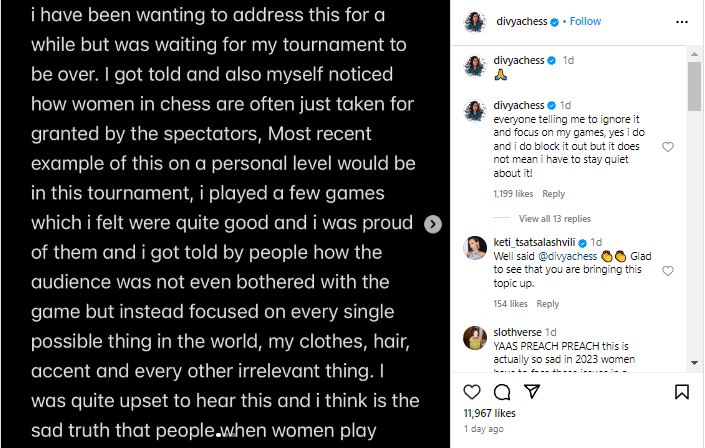 প্রতিযোগিতা শেষ হতেই সমাজমাধ্যমে একটি পোস্ট করেন দিব্যা। তরুণ দাবাড়ু বলেন, “আমি অনেক দিন ধরেই এই বিষয় নিয়ে কথা বলব ভাবছিলাম। অপেক্ষা করছিলাম এই প্রতিযোগিতাটা শেষ হওয়ার। অনেকেই আমাকে বলেছেন এবং আমি নিজেও দেখেছি কী ভাবে মহিলা দাবাড়ুদের খেলাকে গুরুত্বহীন ভাবে দেখা হয়। আমাদের কেমন দেখতে সেটা দর্শকের কাছে বেশি আলোচনার বিষয় হয়ে যায়।”
