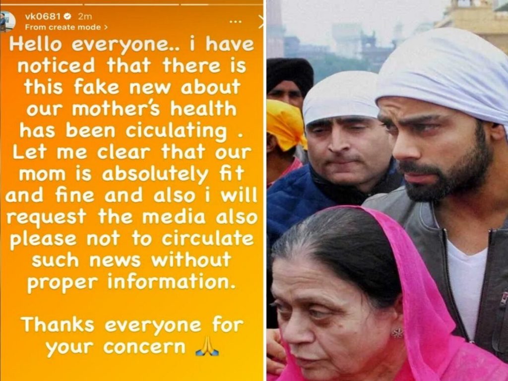 মা সুস্থই আছেন । বুধবার সামাজিক মাধ্যমে মা সরোজ কোহলির সুস্থ থাকার খবর জানান বিরাটের দাদা বিকাশ কোহলি । তিনি লেখেন, মায়ের শরীর খারাপ নিয়ে যে হবর প্রকাশ হয়েছে তা সম্পূর্ণ ভিত্তিহীন । সুস্থই আছেন মা । পাশাপাশি সত্যতা যাচাই না করে খবর প্রকাশ করায় ক্ষুব্ধ বিরাটের দাদা ।