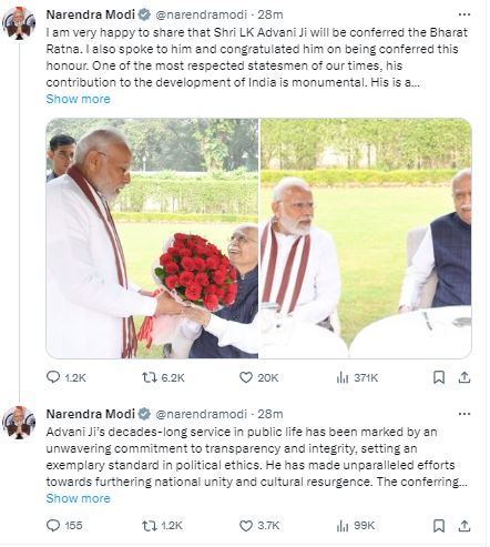 শনিবার সকালে সোশ্যাল মিডিয়া প্ল্যাটফর্ম ‘এক্স’-এ আডবাণীর সঙ্গে দুটি ছবি পোস্ট করে মোদী লেখেন, “আমি অত্যন্ত আনন্দের সঙ্গে ঘোষণা করছি যে শ্রী লালকৃষ্ণ আডবাণীজি’কে ভারতরত্ন প্রদান করা হচ্ছে। তাঁর সঙ্গে কথাও বলেছি আমি। ভারতরত্ন সম্মানে ভূষিত হওয়ার জন্য তাঁকে অভিনন্দন জানিয়েছি। আমাদের সময়ের অন্যতম শ্রদ্ধেয় রাষ্ট্রনায়ক (হলেন আডবাণীজি)। ভারতের উন্নয়নের ক্ষেত্রে তিনি যে অবদান রেখেছেন, তা অভাবনীয়। শনিবার সকালে সোশ্যাল মিডিয়া প্ল্যাটফর্ম ‘এক্স’-এ আডবানির সঙ্গে দুটি ছবি পোস্ট করে মোদী লেখেন, ‘আমি অত্যন্ত আনন্দের সঙ্গে ঘোষণা করছি যে শ্রী লালকৃষ্ণ আডবানিজি’কে ভারতরত্ন প্রদান করা হচ্ছে। তাঁর সঙ্গে কথাও বলেছি আমি। ভারতরত্ন সম্মানে ভূষিত হওয়ার জন্য তাঁকে অভিনন্দন জানিয়েছি। আমাদের সময়ের অন্যতম শ্রদ্ধেয় রাষ্ট্রনায়ক (হলেন আডবানিজি)। ভারতের উন্নয়নের ক্ষেত্রে তিনি যে অবদান রেখেছেন, তা অভাবনীয়। তৃণমূল স্তরে কাজ করার মাধ্যমে তাঁর জীবন শুরু করেছিল। সেই তিনিই উপ-প্রধানমন্ত্রী হিসেবে আমাদের দেশের সেবা করেছেন। আমাদের স্বরাষ্ট্রমন্ত্রী এবং তথ্যপ্রযুক্তি মন্ত্রী হিসেবে উনি নিজেকে পরিচিতি গড়ে তুলেছিলেন।’ স্তরে কাজ করার মাধ্যমে তাঁর জীবন শুরু করেছিল। সেই তিনিই উপ-প্রধানমন্ত্রী হিসেবে আমাদের দেশের সেবা করেছেন। আমাদের স্বরাষ্ট্রমন্ত্রী এবং তথ্যপ্রযুক্তি মন্ত্রী হিসেবে উনি নিজেকে পরিচিতি গড়ে তুলেছিলেন।”