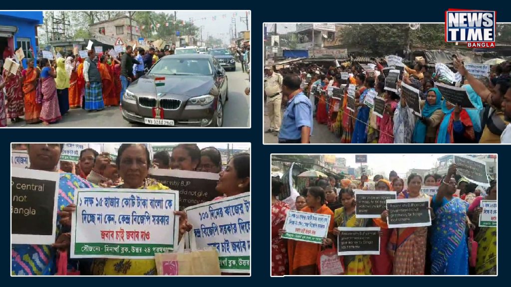 মিনাখাঁ ব্লকের মালঞ্চ বাজারে মিনখাঁ ব্লক তৃণমূলের পক্ষ থেকে হাতে প্লাকার্ড নিয়ে রাজ্যপালের গাড়ি সামনে বিক্ষোভে করতে দেখা যায় । মিনখাঁ বাজার পার করার সময় বিক্ষোভ দেখান তাঁরা । তাঁদের দাবি, কেন্দ্র বিজেপি সরকার ১০০ দিনের কাজের টাকা সহ আবাস যোজনার ঘরের ১ লক্ষ ১৫ হাজার কোটি টাকা আটকে রেখেছে । পাশাপাশি গ্যাসের মূল্যবৃদ্ধির দাবিতেও এদিন বিক্ষোভ দেখান তাঁরা । এদিন যখন রাজ্যপাল সিভি আনন্দ বোসের গাড়ি মালঞ্চ বাজার দিয়ে যায় তখনই বিক্ষোভে সামিল হন তাঁরা ।