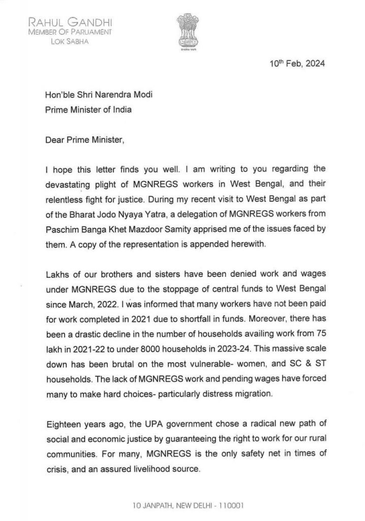 চিঠিতে রাহুল লিখেছেন, “২০২২ সালের মার্চ থেকে পশ্চিমবঙ্গে কেন্দ্রীয় তহবিল বন্ধ। এর ফলে, মনরেগা প্রকল্পের অধীনে কাজ করা এবং মজুরি পাওয়া থেকে বঞ্চিত হয়েছে আমাদের লক্ষ লক্ষ ভাই ও বোন। আমি জানতে পেরেছি, তহবিলের অভাবে ২০২১-এ কাজ করা অনেক কর্মীও তাঁদের প্রাপ্য অর্থ পাননি। তার উপর, ২০২১-২২ অর্থবর্ষে এই প্রকল্পের আওতায় কাজ পেয়েছিল ৭৫ লক্ষ পরিবার। ২০২৩-২৪-এ এর থেকে ৮,০০০ পরিবার বাদ পড়েছে। মবরেগা প্রকল্পের সুবিধা থেকে এই বিপুল সংখ্যক পরিবারের বাদ পড়ার কুপ্রভাব সবথেকে বেশি পড়েছে মহিলা এবং তফসিলি জাতি ও উপজাতি পরিবারগুলির উপর। যারা সমাজের সবথেকে দুর্বল অংশ।”