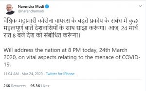 দেশজুড়ে করোনা আতঙ্ক। আক্রান্তের সংখ্যা বাড়ছে প্রতিনিয়ত। লকডাউন প্রায় গোটা ভারতে। পরিস্থিতির মোকাবিলায় মঙ্গলবার ট্যুইটে প্রধানমন্ত্রীর বার্তা, আজ রাত আটটায় ফের জাতির উদ্দেশ্যে ভাষণ দেবেন প্রধানমন্ত্রী মোদী।