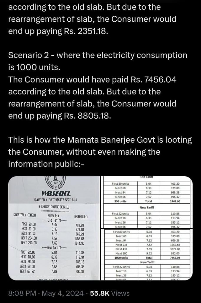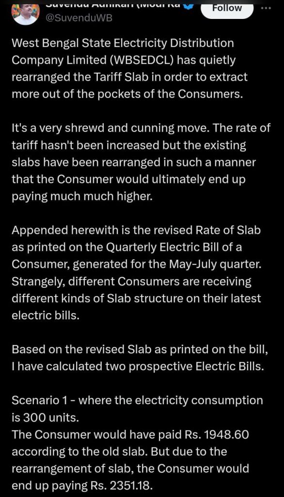 বিধানসভার বিরোধী দলনেতা শুভেন্দু অধিকারী এদিন নিজের এক্স হ্যান্ডেলে জানান, ভোটের মাঝে চুপিসারে রাজ্যে বিদ্যুতের মাশুল বাড়িয়েছে রাজ্য সরকার । একই সঙ্গে তাঁর আরও অভিযোগ ইউনিট পিছু বিদ্যুতের দাম না বাড়ালেও ট্যারিফ স্ল্যাব এমনভাবে বাড়ানোয় হয়েছে তাতে দেখা যাচ্ছে অবশেষে আমজনতার খরচ বেড়ে যাচ্ছে । এই পোস্টের সঙ্গে তিনি প্রকাশ্যে এনেছেন বিদ্যুতের বিলও ।
