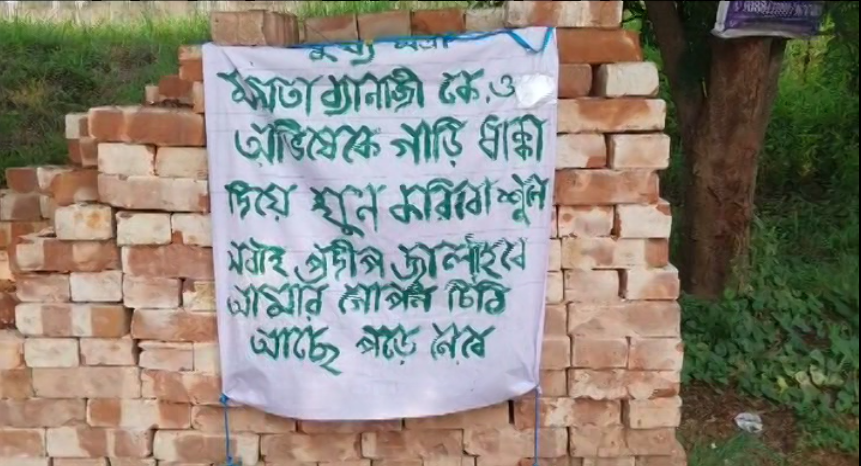 শুক্রবার সকালে উলুবেড়িয়ার মনসাতলায় ১৬ নম্বর জাতীয় সড়কের সার্ভিস লেনে পোস্টার দেখা যায়। একটি সাদা কাপড়ে নীল রঙ দিয়ে লেখা হয়েছে, ‘মুখ্যমন্ত্রী মমতা বন্দ্যোপাধ্যায় ও অভিষেককে গাড়ি ধাক্কা দিয়ে খুন করবো, শুনে সবাই প্রদীপ জ্বালাইবে। আমার গোপন চিঠি আছে পড়ে নেবে।‘ স্থানীয় এলাকায় চাঞ্চল্য শুরু হয়েছে। কে বা কারা এই পোস্টার লাগিয়েছে তা এখনও জানা যায়নি। এই ঘটনায় বিরোধী দলের দিকেই অভিযোগের আঙুল উঠছে।