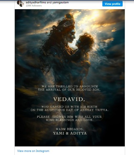 বলিউডে আবার সুখবরের পালা । মা-বাবা হলেন বলিউড অভিনেত্রী ইয়ামি গৌতম ও তাঁর পরিচালক স্বামী আদিত্য ধর । সোমবার সামাজিক মাধ্যমে এই সুখবরটি নিজের অনুগামীদের সঙ্গে ভাগ করে নিলেন এই সুখবর । পুত্রের নাম রেখেছেন বেদাবিদ ।