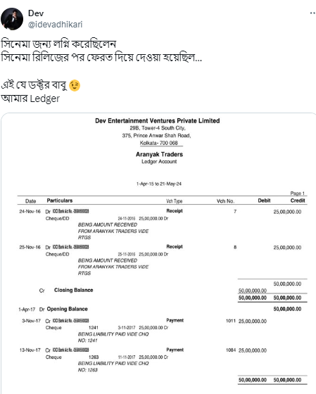 নিজের এক্স হ্যান্ডেলে দেব তাঁর প্রযোজনা সংস্থা দেব এন্টারটেইনমেন্ট ভেঞ্চার্স প্রাইভেট লিমিটেডের সঙ্গে আরণ্যক ট্রেডার্সের টাকার লেনদেনের খতিয়ান প্রকাশ করেছেন দেব। সেখানে নাম না করে হিরণ চট্টোপাধ্যায়কে ‘ডক্টর বাবু’ কটাক্ষ করে তিনি লেখেন, ‘সিনেমার জন্য লগ্নি করেছিলেন সিনেমা রিলিজের পর ফেরত দিয়ে দেওয়া হয়েছিল। এই যে ডক্টরবাবু আমার Ledger।’ ছবিতে দেখা যাচ্ছে, ২০১৭ সালের নভেম্বর মাসেই দু’দফায় ৫০ লক্ষ টাকা ফেরত দিয়েছেন দেব।