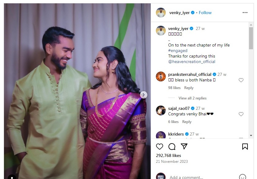 উল্লেখ্য, ২০২৩ সালেই শ্রুতির সঙ্গে বাগদান পর্ব সেরে রেখেছিলেন ভেঙ্কটেশ । ভেঙ্কির বিয়ের ছবি সোশ্যাল মিডিয়ায় ভাইরাল হতেই ভেঙ্কিকে আগামী দিনের জন্য শুভেচ্ছায় ভরিয়ে দেন ক্রিকেটপ্রেমীরা ।
