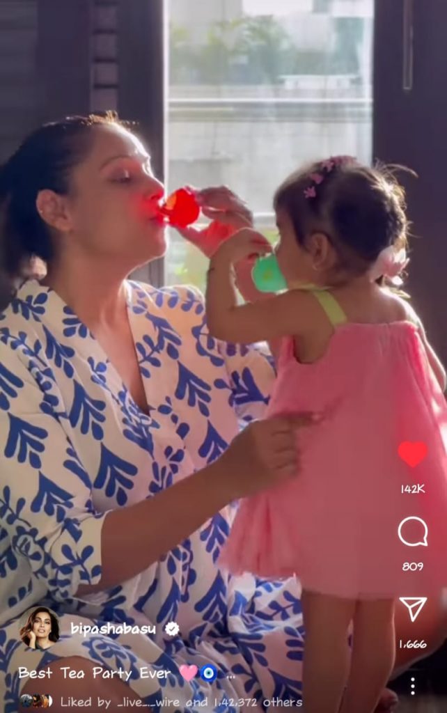 সম্প্রতি তিনি তাঁর সোশ্যাল মিডিয়া হ্যান্ডেলে দেবীর আরেকটি ভিডিয়ো শেয়ার করেছেন । যেখানে দেখা যাচ্ছে বিপাশার একরত্তি মেয়ে দেবী, তাঁর সঙ্গে চা পার্টিতে মত্ত । না না এই চা পার্টি, কোন ক্যাফেতে গিয়ে করা চা পার্টি নয় । খেলনাবাটি নিয়ে চা করতে ব্যস্ত খুদে । শুধু তাই নয়, সেই চা তাঁর মাকে খাইয়েও দিচ্ছে সে । মা- মেয়ের এই ভিডিও সামনে আসতেই মন জয় করেছে নেটিজেনদের ।