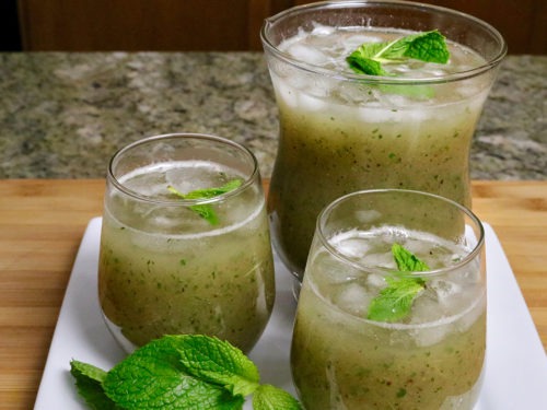 এই শরবতটি বানাতে প্রয়োজন কাঁচা আম,রোস্টেড জিরেগুঁড়ো,বিটনুন,শুকনো লঙ্কাগুঁড়ো,পুদিনা পাতা, চিনি।প্রথমে আম ভালো করে ধুয়ে খোসা ছাড়িয়ে সেদ্ধ করে নিন। এবার আমের পাল্প বের করে নিয়ে তাতে পুদিনা পাতা, নুন, চিনি, বিটনুন, তাজা জিরে ও শুকনো লঙ্কাগুঁড়ো দিয়ে অল্প জল দিয়ে একটি মিশ্রণ তৈরি করে নিন । এবার ওই মিশ্রণ কাঁচের গ্লাসে ঢেলে ওপর থেকে ঠান্ডা জল ও সোডা ওয়াটার দিয়ে বিটনুন ও পুদিনা পাতা সাজিয়ে ঠান্ডা ঠান্ডা পরিবেশন করুন আম-পুদিনার শরবত ।