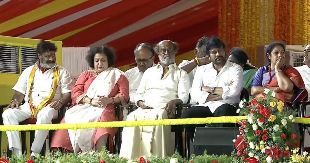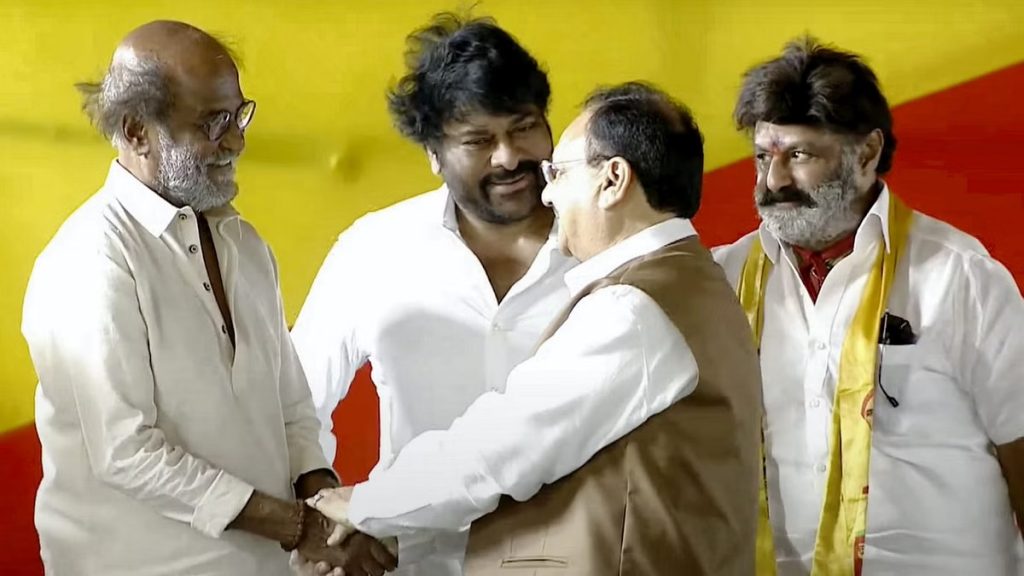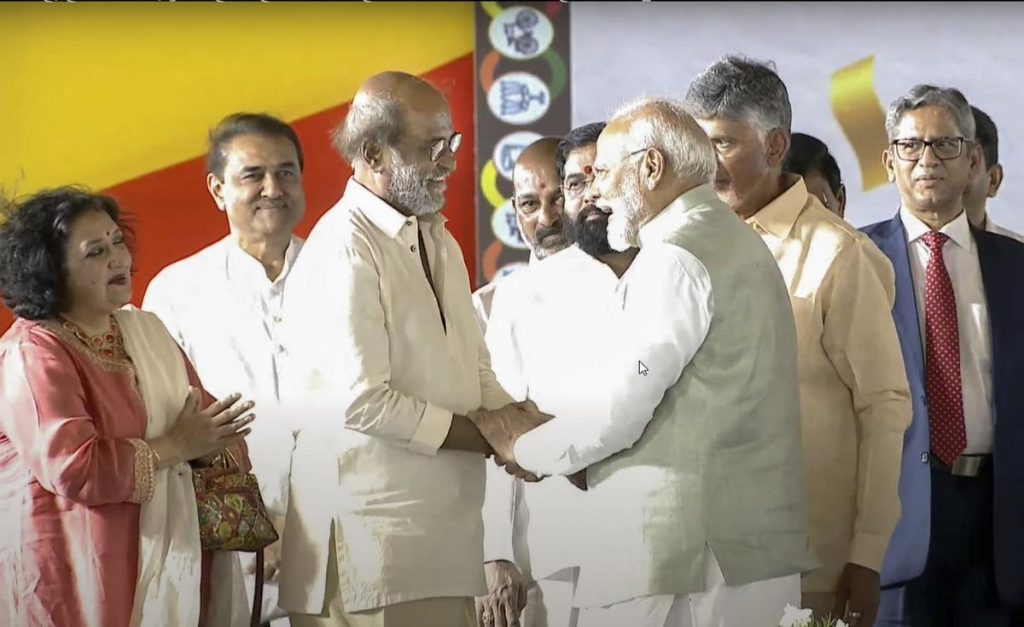 সেই সঙ্গে একই মঞ্চে দেখা যায় দক্ষিণী সুপারস্টার রজনীকান্তকেও । স্ত্রীকে নিয়ে রজনীকান্ত নাইডুর শপথে হাজির হয়ে মোদীর সঙ্গে দেখা করেন । নাইডুর তারকা-খচিত শপথ অনুষ্ঠানে মোদীর সঙ্গে সাক্ষাতে হাজির হন অপর তেলুগু অভিনেতা নন্দমুরি বালাকৃষ্ণও । এছাড়াও ছিলেন চিরঞ্জীবীর পুত্র রাম চরন, আল্লু অর্জুন, এনটিআর জুনিয়র, মোহন বাবু সহ আরও অনেকে । শপথগ্রহণ অনষ্ঠানে গ্রহ-নক্ষত্রদের ভিড়ের মাঝেও সার্বিকভাবে কিন্তু মঞ্চে এনডিএর ঐক্যের ছবি দেখা গিয়েছে ।
