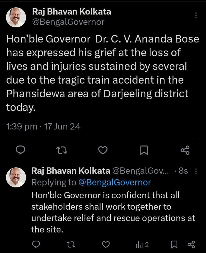 একই সঙ্গে এই দুর্ঘটনায় শোকপ্রকাশ করেছেন রাজ্যপাল সিভি আনন্দ বোস । রাজভবনের পক্ষ থেকে সামাজিক মাধ্যমে জানানো হয় সকলে একযোগে মিলে উদ্ধার কাজ চালিয়ে যাবেন ।