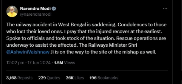 দুর্ঘটনার খবরে উদ্বিগ্ন প্রধানমন্ত্রী নরেন্দ্র মোদী । আহতদের পাশে থাকার বার্তা দিয়েছেন দেশের প্রধানমন্ত্রী নরেন্দ্র মোদী । মৃতদের পরিবারকে আর্থিক ক্ষতিপূরণ দেওয়ার ঘোষণা করেন তিনি । আহতদের ৫০ হাজার টাকা দেওয়ার পাশাপাশি মৃতদের পরিবারকে ২ লক্ষ টাকা দেওয়ার ঘোষণা করা হয় এদিন । ওয়াররুম থেকে নজরদারি চালান কেন্দ্রীয় রেলমন্ত্রীর অশ্বিনী বৈষ্ণব । দুর্ঘটনাস্থলের উদ্দেশে রওনা দেন তিনি ।