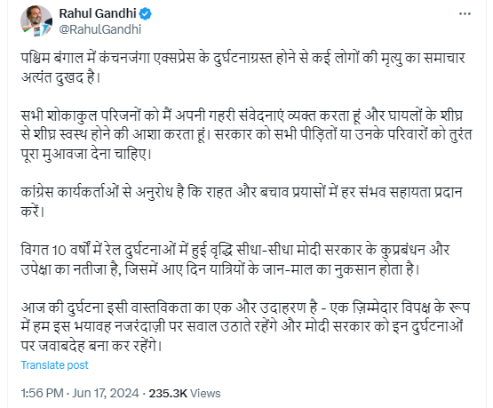 উত্তরবঙ্গে কাঞ্চনজঙ্ঘা এক্সপ্রেস দুর্ঘটনায় বাড়ছে মৃতের সংখ্যা। আহতের সংখ্যা একাধিক। শোকপ্রকাশ করেছেন প্রধানমন্ত্রী নরেন্দ্র মোদী। ঘটনাস্থলে গিয়েছেন কেন্দ্রীয় রেলমন্ত্রী অশ্বিনী বৈষ্ণব। কেন্দ্রের তরফে আর্থিক ক্ষতিপূরণের ঘোষণা করা হয়েছে। তবে এই ভয়াবহ দুর্ঘটনায় কেন্দ্রীয় সরকারের দিকেই আঙুল তুললেন কংগ্রেস সাংসদ রাহুল গান্ধী।