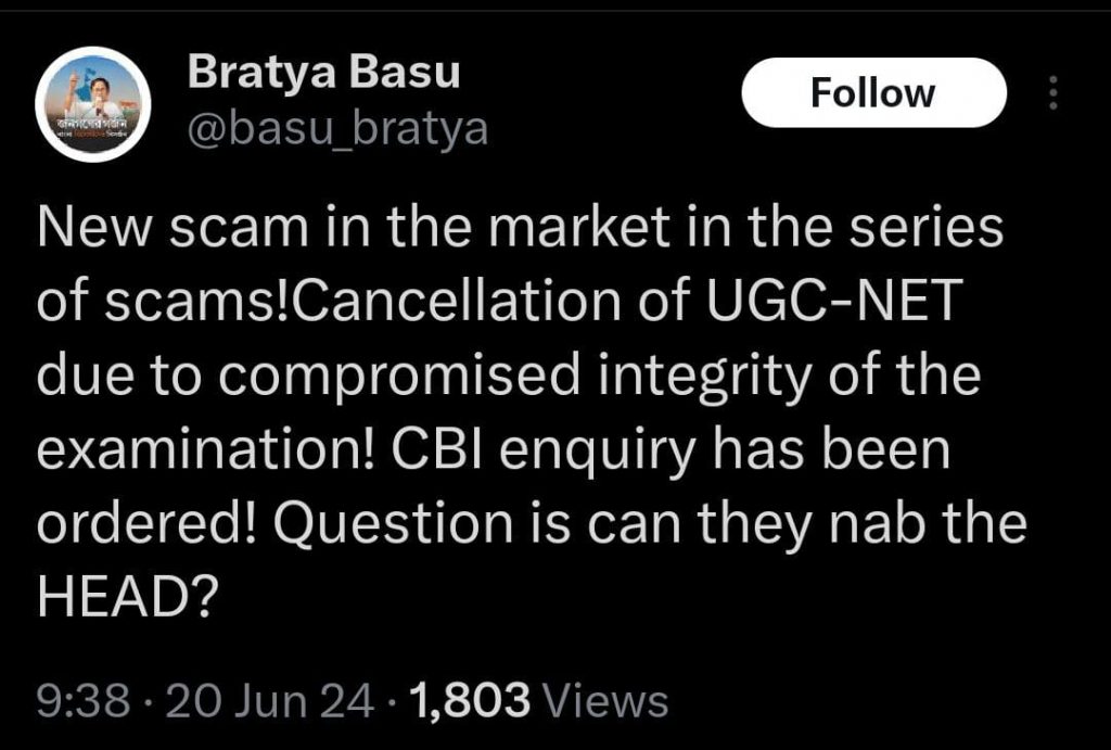 প্রসঙ্গত, পরীক্ষার ১ দিন পরেই বাতিল করা হল গবেষণার প্রবেশিকা পরীক্ষা । অভিযোগ ওঠে, গোটা দেশজুড়ে যে ইউজিসি-নেট ২০২৪ পরীক্ষা নেওয়া হয়েছিল, তাতে কিছু বেনিয়ম হয়েছিল । সেই সকল বেনিয়ম নিয়ে প্রশ্ন ওঠে পরীক্ষার স্বচ্ছতা নিয়ে । পরীক্ষাটিকে কেন্দ্র করে ওঠে, প্রশ্নফাঁসের অভিযোগ । তাই পরীক্ষা বাতিলের সিদ্ধান্ত নেওয়া হয় । গরমিলের বিষয়টি নিয়ে তদন্ত করতে সিবিআই-কেও নির্দেশ দেওয়া হয় । ন্যাশনাল সাইবার ক্রাইম অ্যানালিটিক্স সন্দেহজনক কিছু তথ্য দেয় বিশ্ববিদ্যালয় মঞ্জুরি কমিশনকে (ইউজিসি) । স্বরাষ্ট্রমন্ত্রকের অধীনস্থ সংস্থার তথ্যের ভিত্তিতে বাতিল করা হয় ২০২৪ সালের জুন মাসের নেট পরীক্ষা । জানা যায়, সেই তথ্যের উপর নির্ভর করেই বোঝা যায়, পরীক্ষা ব্যবস্থায় স্বচ্ছতার অভাব ছিল ।