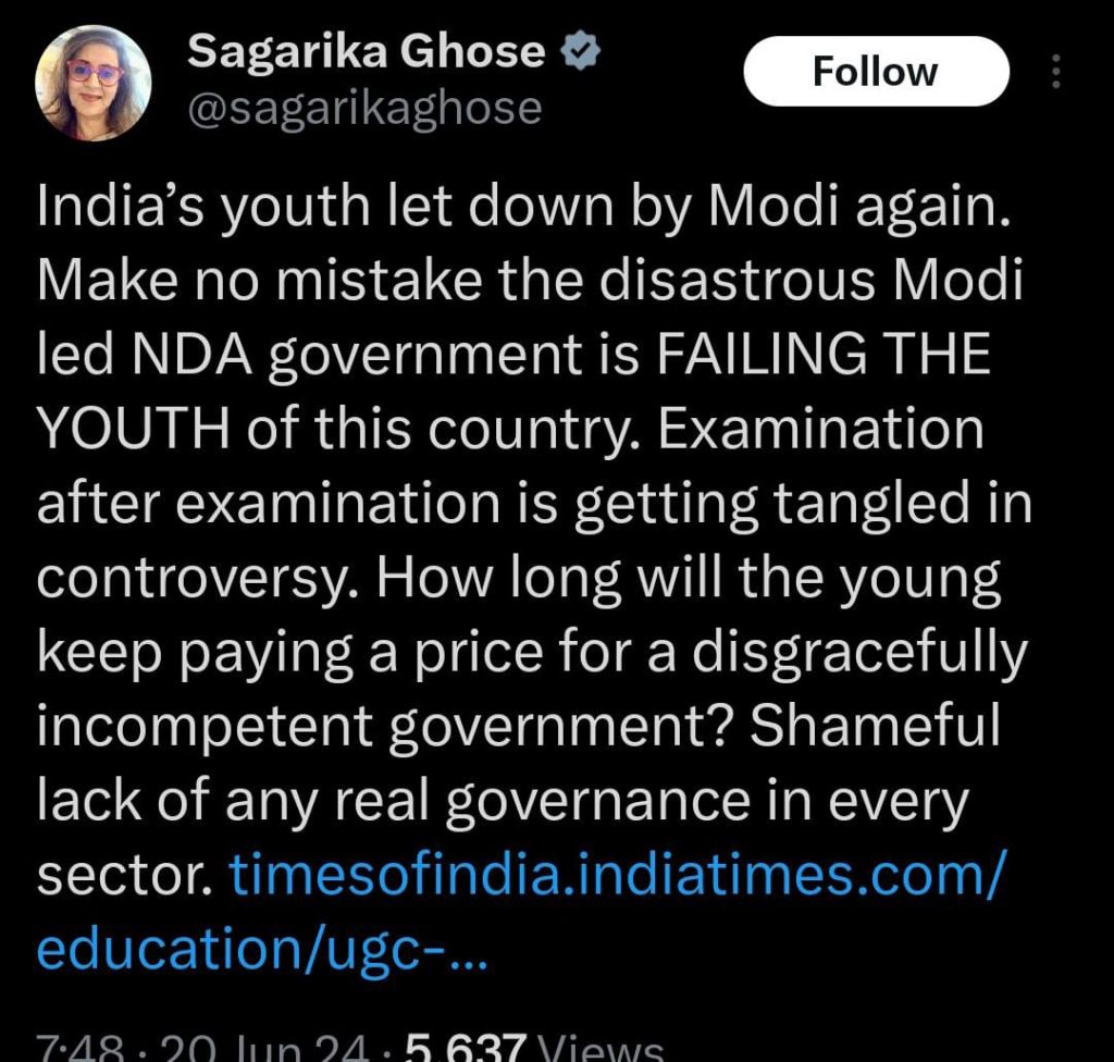 মোদী সরকারকে তোপ দাগলেন রাজ্যও সভার সাংসদ সাগরিকা ঘোষ । সামাজিক মাধ্যমে তাঁর আক্রমণ, ‘ফের ভারতীয় তরুণদের হতাশ করলেন মোদী । একের পর এক পরীক্ষা নিয়ে বিতর্ক,‘অযোগ্য সরকারের জন্য আর কত মূল্য দেবে তরুণরা?’