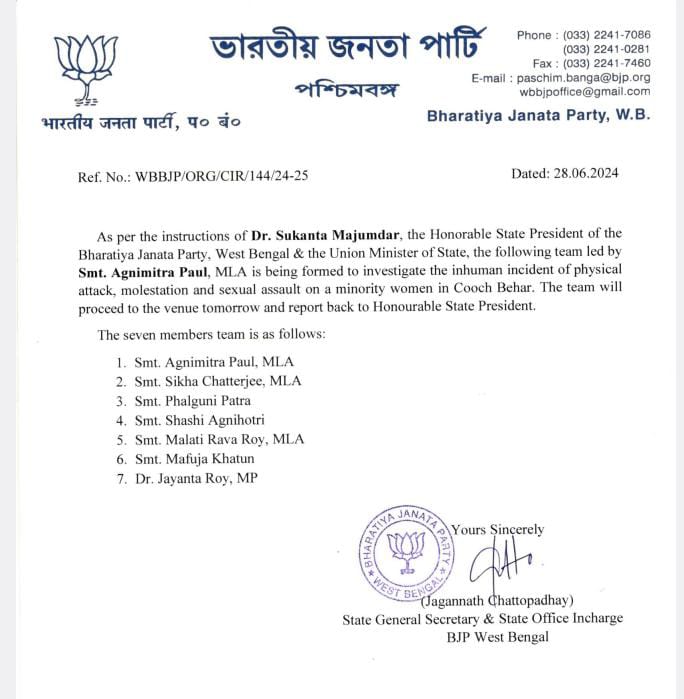 সুকান্ত মজুমদারের তৈরি এই কমিটিতে রয়েছেন বিজেপির বিধায়ক অগ্নিমিত্রা পাল, শিখা চট্টোপাধ্যায়, মালতী রাভা রায়, মাফুজা খাতুন, ফাল্গুনি পাত্র, শশী অগ্নিহোত্রী, সাংসদ জয়ন্ত রায়। প্রতিনিধি দলের নেতৃত্বে থাকবেন অগ্নিমিত্রা পাল। কোচবিহারে গিয়ে পরিস্থিতি খতিয়ে দেখে বিজেপির রাজ্য সভাপতির কাছে রিপোর্ট তলব করবেন তাঁরা।