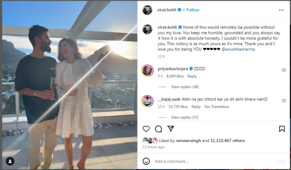 অনুষ্কার সঙ্গে একটি সুন্দর মুহূর্তের ছবি ইনস্টাগ্রামে পোস্ট করে স্ত্রীর উদ্দেশ্যে বিরাট কোহলি লেখেন, ‘আমার ভালোবাসা, তোমাকে ছাড়া এটা সম্ভব হত না । তুমিই আমাকে বিনয়ী করে তুলেছ, মাটিতে পা রাখতে শিখিয়েছ । তোমার কাছে আমি কৃতজ্ঞ । এই জয় যতটা আমার, ততটা তোমারও । ’