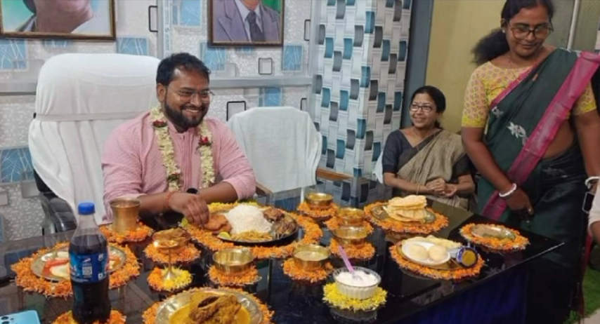 শুভেন্দুর পোস্ট করা ভিডিয়োয় দেখা যাচ্ছে, টেবিলের সামনে বিভিন্ন খাবারের থালা মালা দিয়ে সাজিয়ে রাখা হয়েছে। পাঞ্জাবি পড়ে রয়েছেন বিডিও। যুব তৃণমূল নেতা তথা কর্মাধ্যক্ষ মানস ভট্টাচার্য তাঁর গলায় রজনীগন্ধার মালা পরিয়ে দিলেন। পরে তৃণমূলের ব্লক সভাপতি তথা বর্ধমান উন্নয়ন পর্ষদের চেয়ারম্যান কাকলি গুপ্তের কাছ থেকে চন্দনের ফোঁটা নিচ্ছেন বিডিও। তারপর ওই নেত্রীকে পায়ে হাত দিয়ে প্রণাম করছেন।
