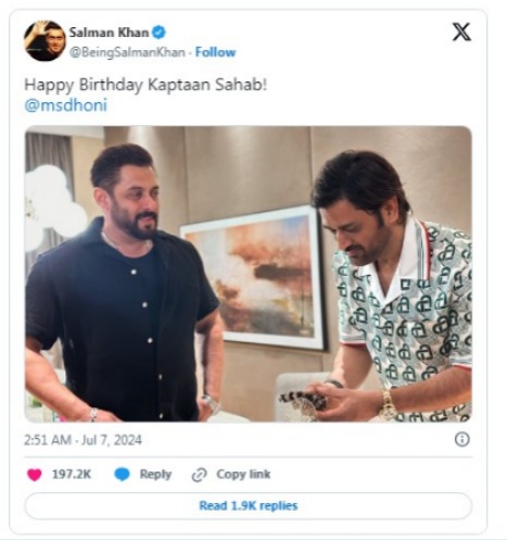 এদিনের সেলিব্রেশনে ছিলেন বলিউডের ভাইজান সলমন খানও । ভারতীয় ক্রিকেটের সফলতম প্রাক্তন অধিনায়ককে জন্মদিনের শুভেচ্ছা জানিয়ে কিছু মুহুরত ভাগ করে নেন তিনিও ।