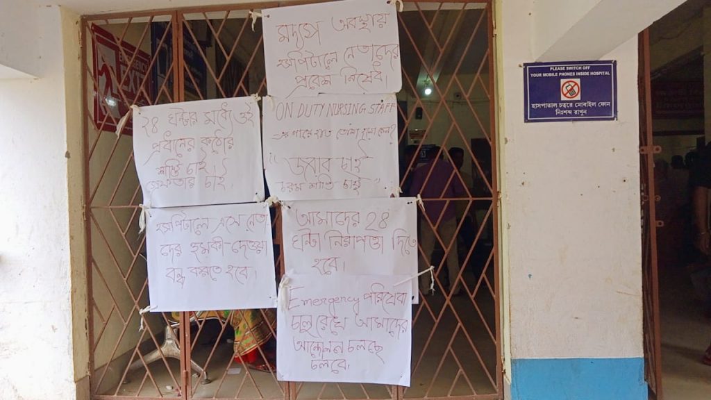 কর্তব্যরত নার্সকে চড় মারার অভিযোগ উঠল সালারের তৃণমূল প্রধানের বিরুদ্ধে । রবিবার সকাল থেকেই এই ঘটনার বিরুদ্ধে হাসপাতালের গেটের সামনে ধর্নায় বসে প্রতিবাদ দেখাচ্ছেন হাসপাতালের নার্সরা ।