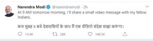 নিউজটাইম ওয়েবডেস্ক : বৃহস্পতিবারের পর করোনা আবহে আবারও দেশবাসীর উদ্দেশে বার্তা দেবেন প্রধানমন্ত্রী নরেন্দ্র মোদী। শুক্রবার সকাল ৯টায় দেশবাসীর উদ্দেশে ভিডিও বার্তা দেবেন বলে টুইট করে জানালেন স্বয়ং প্রধানমন্ত্রী। তবে ঠিক কী নিয়ে বার্তা দেবেন মোদী, সেই বিষয় স্পষ্ট নয়। করোনাভাইরাস পরিস্থিতি ও লকডাউন নিয়েই দেশবাসীর উদ্দেশে প্রধানমন্ত্রী বার্তা দেবেন বলে মনে করা হচ্ছে।