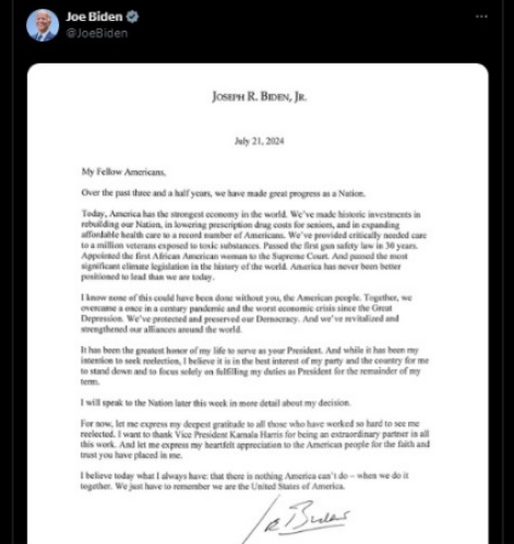 বেশ কয়েকদিন ধরে দলের অন্দরেই বাইডেনকে নিয়ে চলছিল নানান জল্পনা । শারীরিক অসুস্থতার সঙ্গে দোসর হয়েছিল তাঁর বাড়তে থাকা বয়স । এমনকি একাধিকবার তাঁর অসংলগ্ন কথাবার্তাও নজরে এসেছিল রাজনৈতিক মহলে । এর সঙ্গে ডিবেটে প্রাক্তন প্রেসিডেন্ট তথা এবারের প্রেসিডেন্ট পদের রিপাবলিকান প্রার্থী ডোনাল্ড ট্রাম্পের কাছে ধরাশায়ী হওয়ার পর ডেমক্র্যাট মহলে চাপ আরও বৃদ্ধি পায় ।