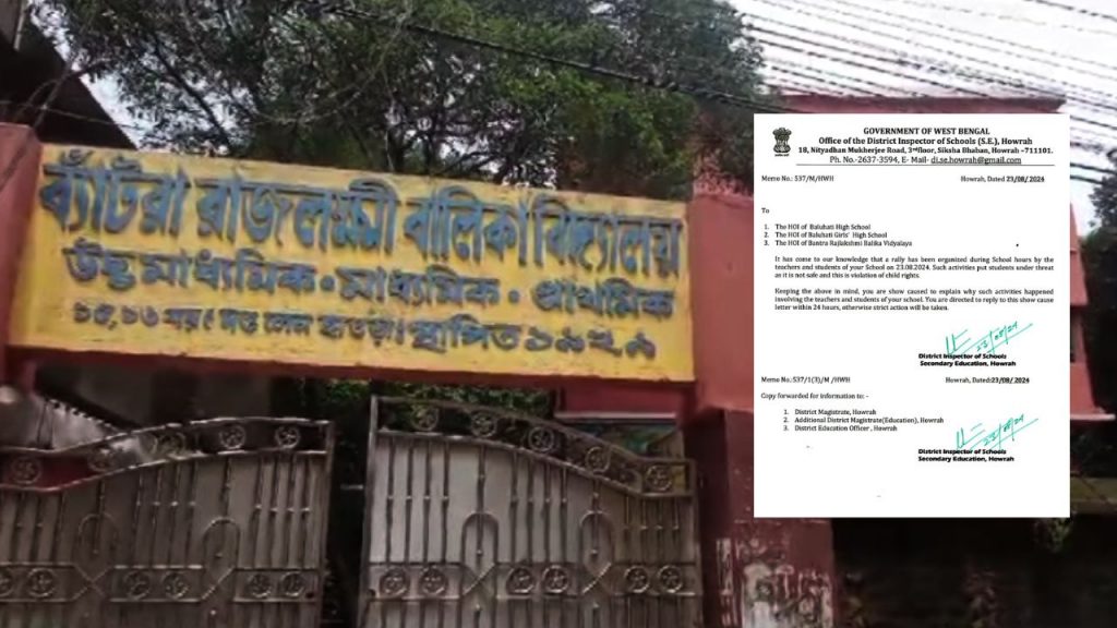 ব্যাটরা রাজলক্ষ্মী বালিকা বিদ্যালয়, বলুহাটি গার্লস হাইস্কুল ও বলুহাটি হাই স্কুল- এই তিনটি স্কুলকে নোটিস পাঠানো হয়েছে। গত ৯ আগস্ট আরজি কর হাসপাতালের সেমিনার হল থেকে কর্তব্যরত এক তরুণী চিকিৎসকের দেহ উদ্ধার হয়। তাঁকে ধর্ষণ ও খুন করা হয়েছে,ময়না তদেন্ত তা জানানো হয়েছে। এই ঘটনার প্রতিবাদে আন্দোলনে সামিল সব মহল। তেমনই তিন স্কুলের প্রাক্তনী সহ পড়ুয়ারা মিছিল করে। এবার ওই তিন স্কুলের কর্তৃপক্ষের কাছ থেকে জবাব চাইল জেলা শিক্ষা দফতর।