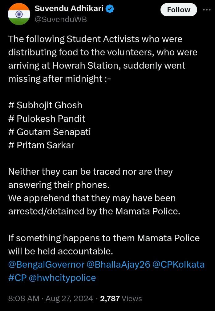 চার ছাত্র নেতার নিখোঁজের অভিযোগ তুলে কলকাতা পুলিশের কাছে জবাব তলব করলেন রাজ্যের বিরোধী দুনেতা শুভেন্দু অধিকারী । একদিকে আজ সকালেই ছাত্র সমাজের ঘাটে নবান্ন অভিযানে বিজয়ী হওয়ার বার্তা জানিয়ে টুইট করেন শুভেন্দু অধিকারী । অন্যদিকে ছাত্র সমাজের চার নেতা যারা গতকাল হাওড়া এলাকায় ভলান্টিয়ার-এর কাজে নিযুক্ত ছিলেন, তাদের নিখোঁজের অভিযোগ তুলে জবাব তলব করেছেন প্রশাসনের কাছে ।
