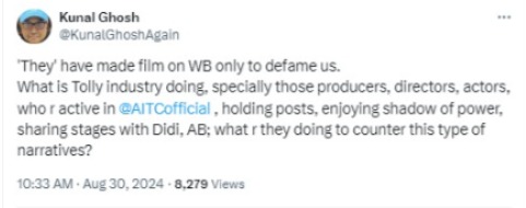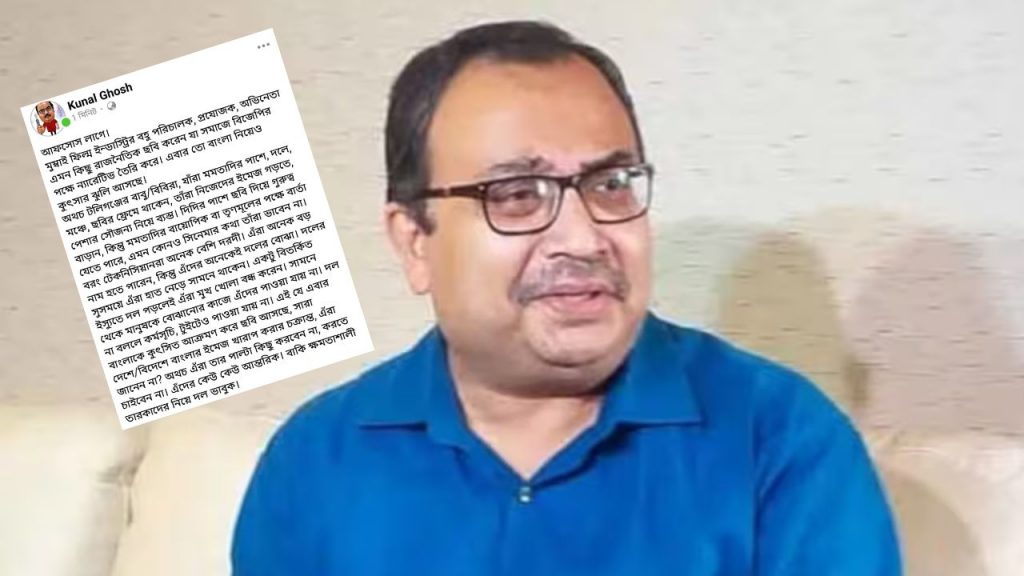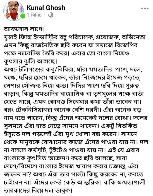 আরও একটি পোস্টে কুণাল ঘোষ লেখেন, ‘আফসোস লাগে। মুম্বই ফিল্ম ইন্ডাস্ট্রির বহু পরিচালক, প্রযোজক, অভিনেতা এমন কিছু রাজনৈতিক ছবি করেন যা সমাজে বিজেপির পক্ষে ন্যারেটিভ তৈরি করে। এবার তো বাংলা নিয়েও কুৎসার ঝুলি আসছে।…’ এছাড়া এই পোস্টেই টলি তারকাদের ‘টলিগঞ্জের বাবু/বিবিরা’ বলে কটাক্ষ করে লেখেন, যাঁরা মমতাদির পাশে, দলে, মঞ্চে, ছবির ফ্রেমে থাকেন, তাঁরা নিজেদের ইমেজ গড়তে, পেশার সৌজন্য নিয়ে ব্যস্ত। দিদির পাশে ছবি দিয়ে গুরুত্ব বাড়ান, কিন্তু মমতাদির বায়োপিক বা তৃণমূলের পক্ষে বার্তা যেতে পারে, এমন কোনও সিনেমার কথা তাঁরা ভাবেন না।‘ অভিযোগ জানিয়েই যোগ করেছেন, ‘এঁরা অনেক বড় নাম হতে পারেন, কিন্তু এঁদের অনেকেই দলের বোঝা। দলের সুসময়ে এঁরা হাত নেড়ে সামনে থাকেন। একটু বিতর্কিত ইস্যুতে দল পড়লেই এঁরা মুখ খোলা বন্ধ করেন। সামনে থেকে মানুষকে বোঝানোর কাজে এঁদের পাওয়া যায় না।‘