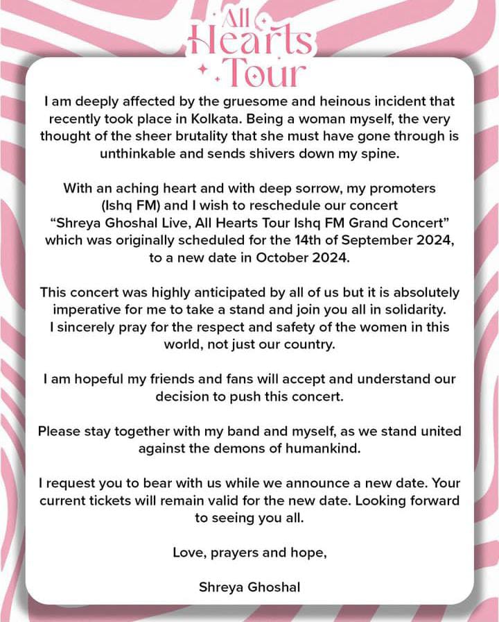 শ্রেয়া ঘোষাল নিজের সোশ্যাল মিডিয়ায় একটি বিবৃতি দিয়ে লেখেন, ‘সম্প্রতি কলকাতায় যে নৃশংস ঘটনা ঘটেছে তা আমাকে গভীরভাবে প্রভাবিত করেছে। নির্যাতিতাকে যে অত্যাচার সহ্য করতে হয়েছে তা ভাবলেই একজন নারী হিসেবে আমার হাড়হিম হয়ে আসছে।‘ কনসার্টটি আগামী অক্টোবরে হবে একথাও পোস্টে জানিয়েছেন শ্রেয়া। পাশাপাশি এই পরিস্থিতিতে সকলকে একসঙ্গে প্রতিবাদে সামিল হওয়ার বার্তা দিয়েছেন তিনি।