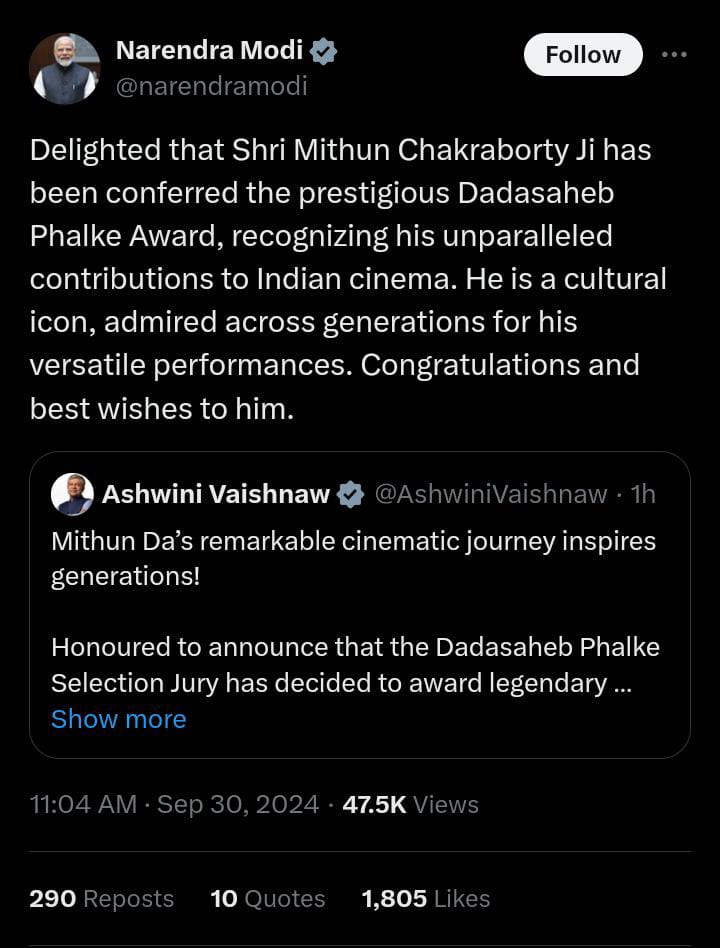 খবরটি ঘোষণা হওয়ার পরই এক্স হ্যান্ডেলে টুইট করে মিঠুন চক্রবর্তীকে অভিন্দন জানিয়েছেন প্রধানমন্ত্রী নরেন্দ্র মোদী । একই সঙ্গে শুভেচ্ছা বার্তা দিয়েছেন কেন্দ্রীয় মন্ত্রী অশ্বিনী বৈষ্ণবও । তাঁকে অভিনন্দন জানিয়েছেন বিজেপির রাজ্য সভাপতি সুকান্ত মজুমদারও ।