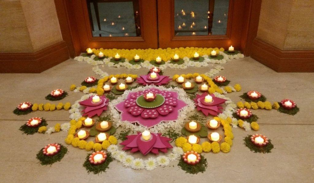 দীপাবলিতে রঙ্গোলি আঁকা বেশ জনপ্রিয় হয়ে উঠেছে। রঙিন গুঁড়োয় সহজ কিছু নকশা এঁকে নিতে পারেন।