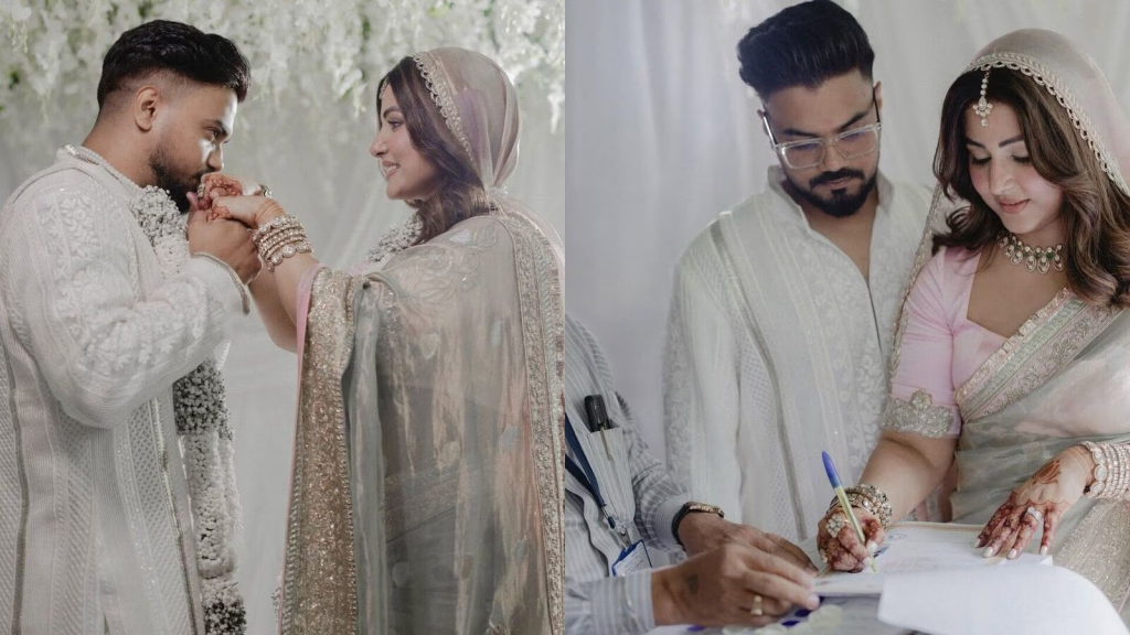 সাদামাটা ভাবে বিয়ে হল হিনা ও রকির। অভিনেত্রীর পরনে ছিল হালকা গোলাপি রংয়ের লেহেঙ্গা ও গলায় মুক্তোর মালা। এদিকে রকির পরনে ছিল সাদা রংয়ের পাঞ্জাবি। নিজেদের বিয়ের ছবি সমাজমাধ্যমে প্রকাশ্যে এনেছেন অভিনেত্রী। যা দেখে খুশি অনুরাগীরা। দীর্ঘদিন ধরে ক্যান্সারে আক্রান্ত অভিনেত্রী হিনা খান। কেমোথেরাপি চলাকালীন যন্ত্রণার সমস্ত কথা ছবি অভিনেত্রী নিজে তুলে ধরেছেন অনুরাগীদের কাছে। কিন্তু, সব যন্ত্রনা সহ্য করেও কিছুদিন আগে যোগ দিয়েছিলেন কাজে। তবে অভিনেত্রীর বিয়ে নিয়ে জল্পনা চলছিলই! কবে বিয়ে করবেন হিনা-রকি? এবার সেই জল্পনাই হল সত্যি।Latest posts by news_time (see all)